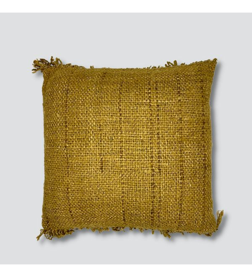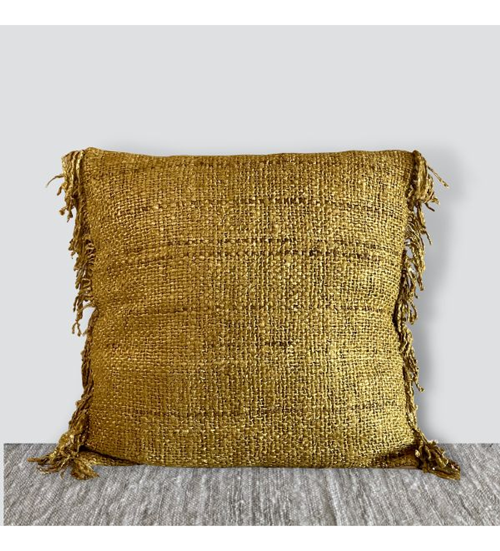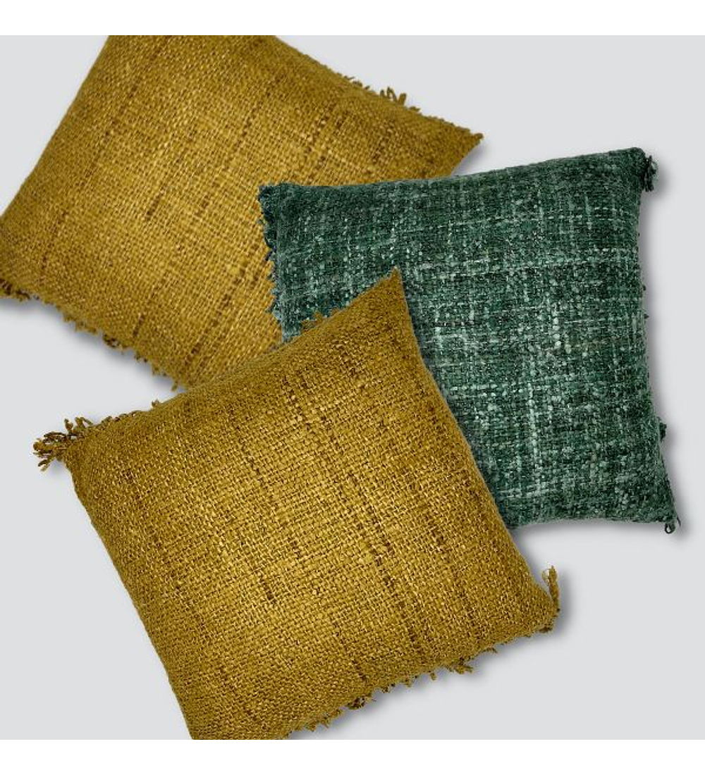 Cojín con flecos de algodón y seda rústica, teñido artesanal, oliva. Mide 50cm x 50cm . Hecho en India, incluye relleno
