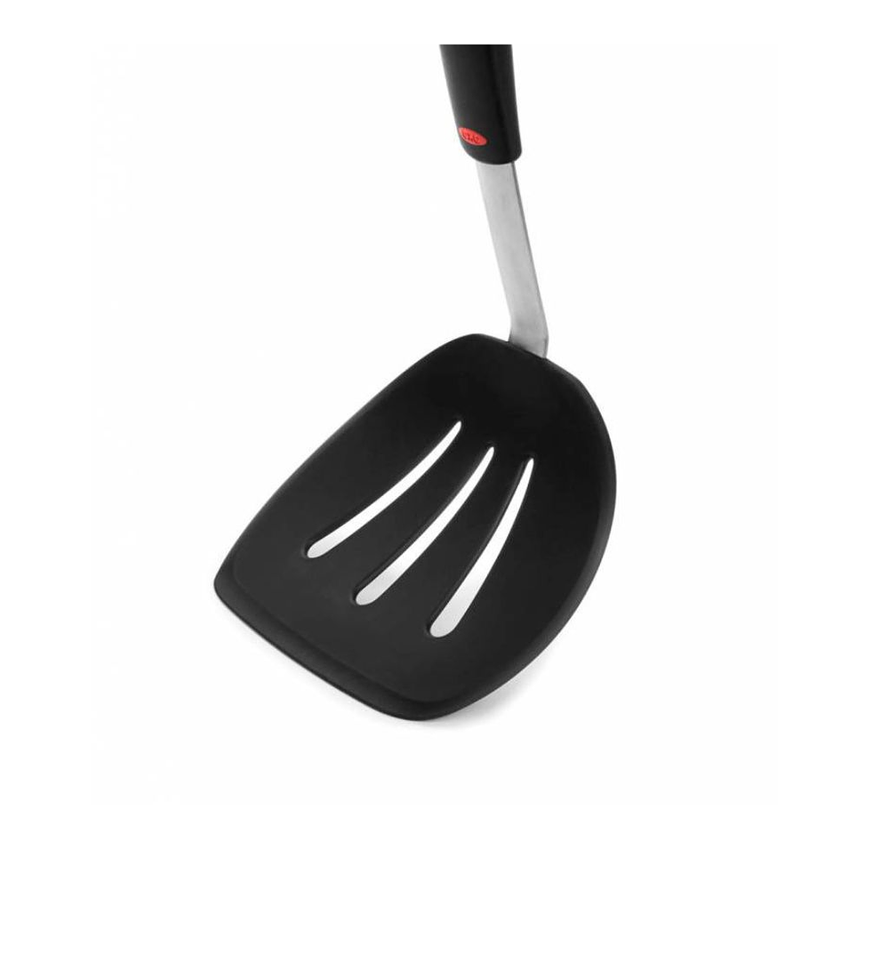 La Espátula Flexible Grande Ranurada de Silicona de Oxo combina la dureza del acero inoxidable con la resistencia al calor y la capacidad antiadherente de una capa externa de silicona. Tiene bordes delgados y flexibles que mantienen intactos los alimentos. Resiste hasta 315°C y puede usarse en sartenes antiadherentes.