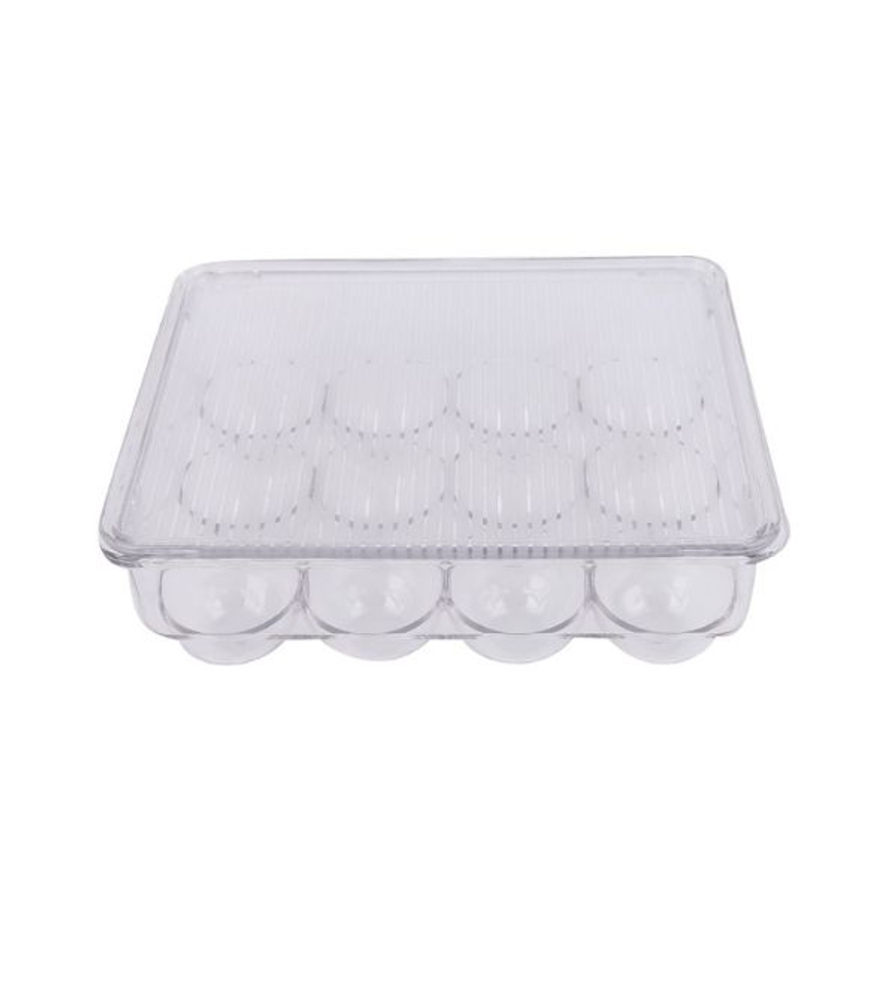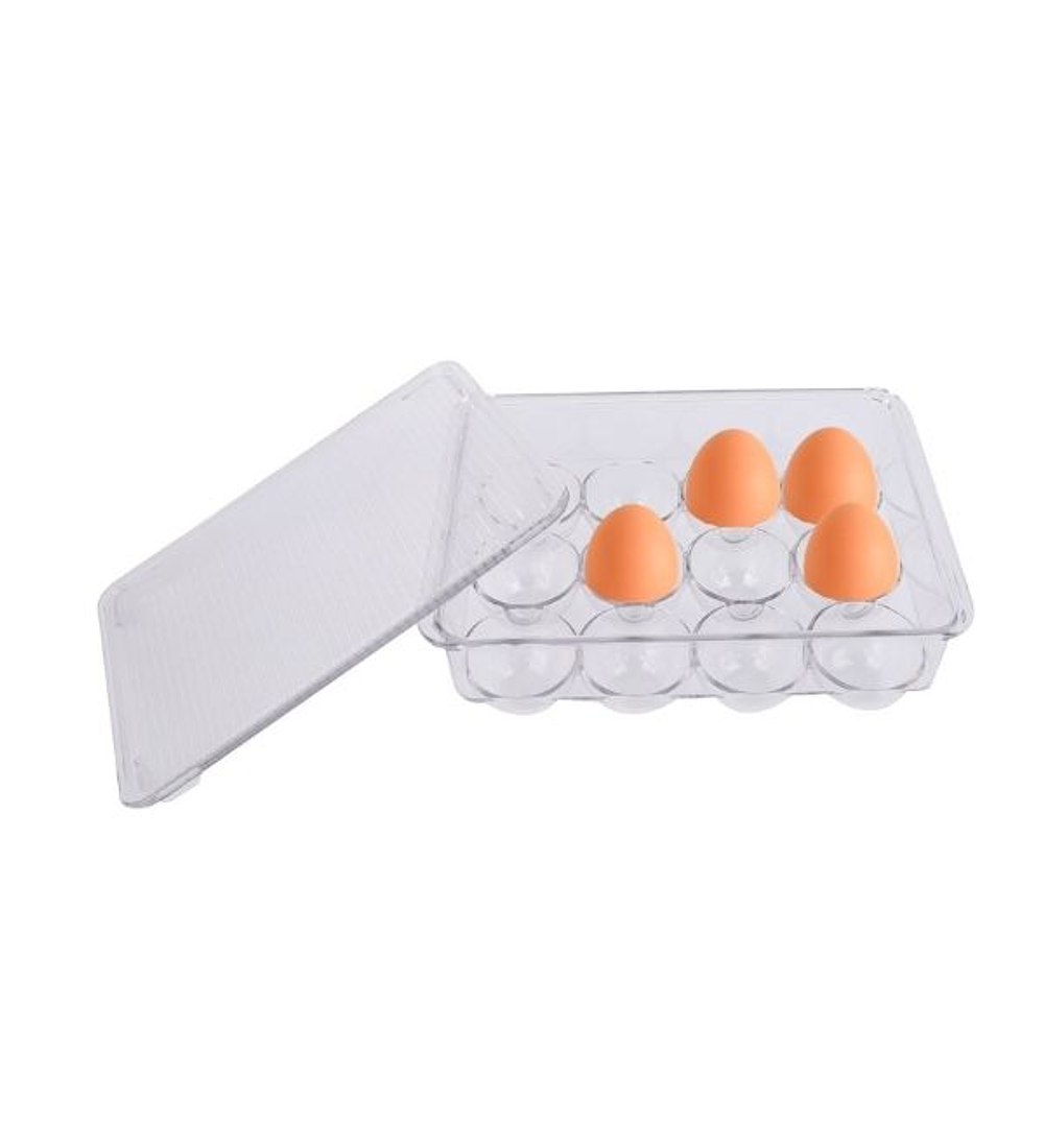 Organizador para huevos de acrílico de alta resistencia con tapa. Capacidad para 12 huevos. Se pueden guardar en el refrigerador o fuera de él protegiéndolos de golpes.