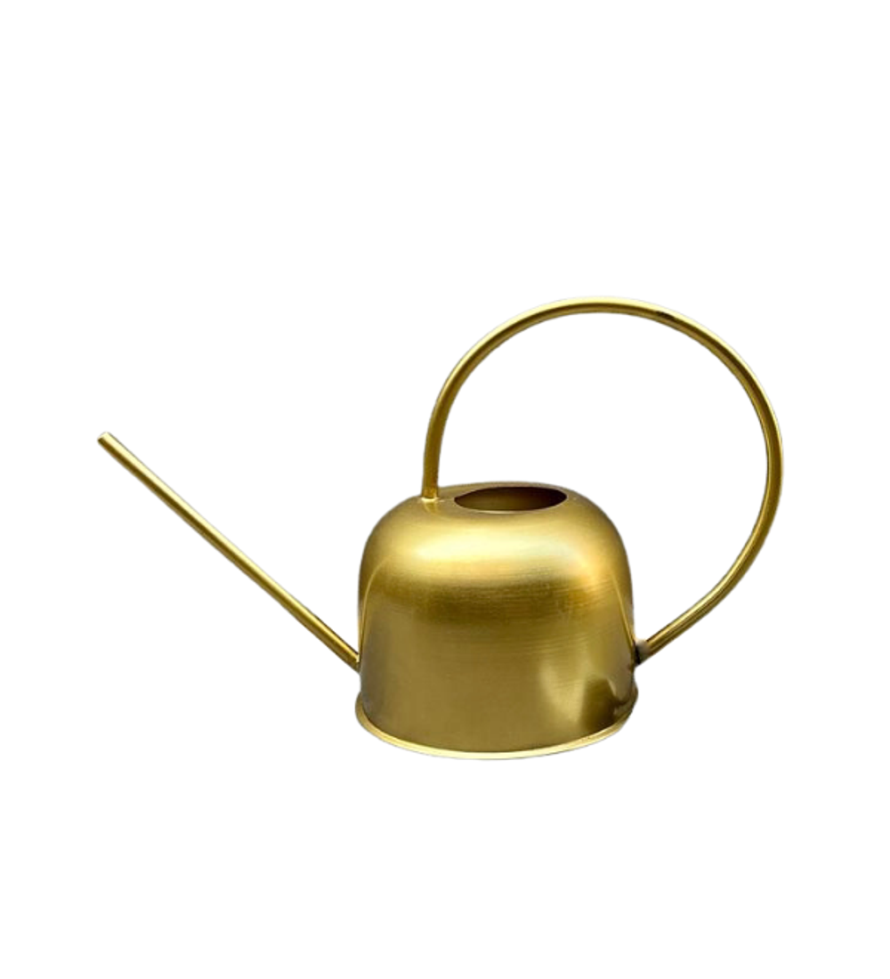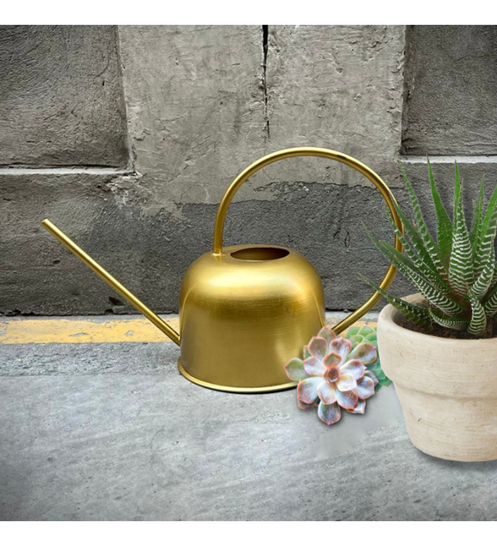 Regadera metálica con terminación dorado mate de lineas simples. Es un elemento decorativo que queda bien en cualquier lugar de tu casa. Mide 13cm de alto x 16cm de diam. Alto y ancho total manilla y vertedor incluido 23cm x 36cm